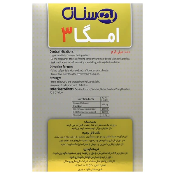 امگا 3 1000 میلی گرم بهستان محصولی است که منبعی غنی از اسیدهای چرب ضروری برای بدن فراهم میکند. هر سافتژل این مکمل حاوی 180 میلی گرم EPA و 120 میلیگرم DHA به همراه 10 میلی گرم ویتامین E است.
