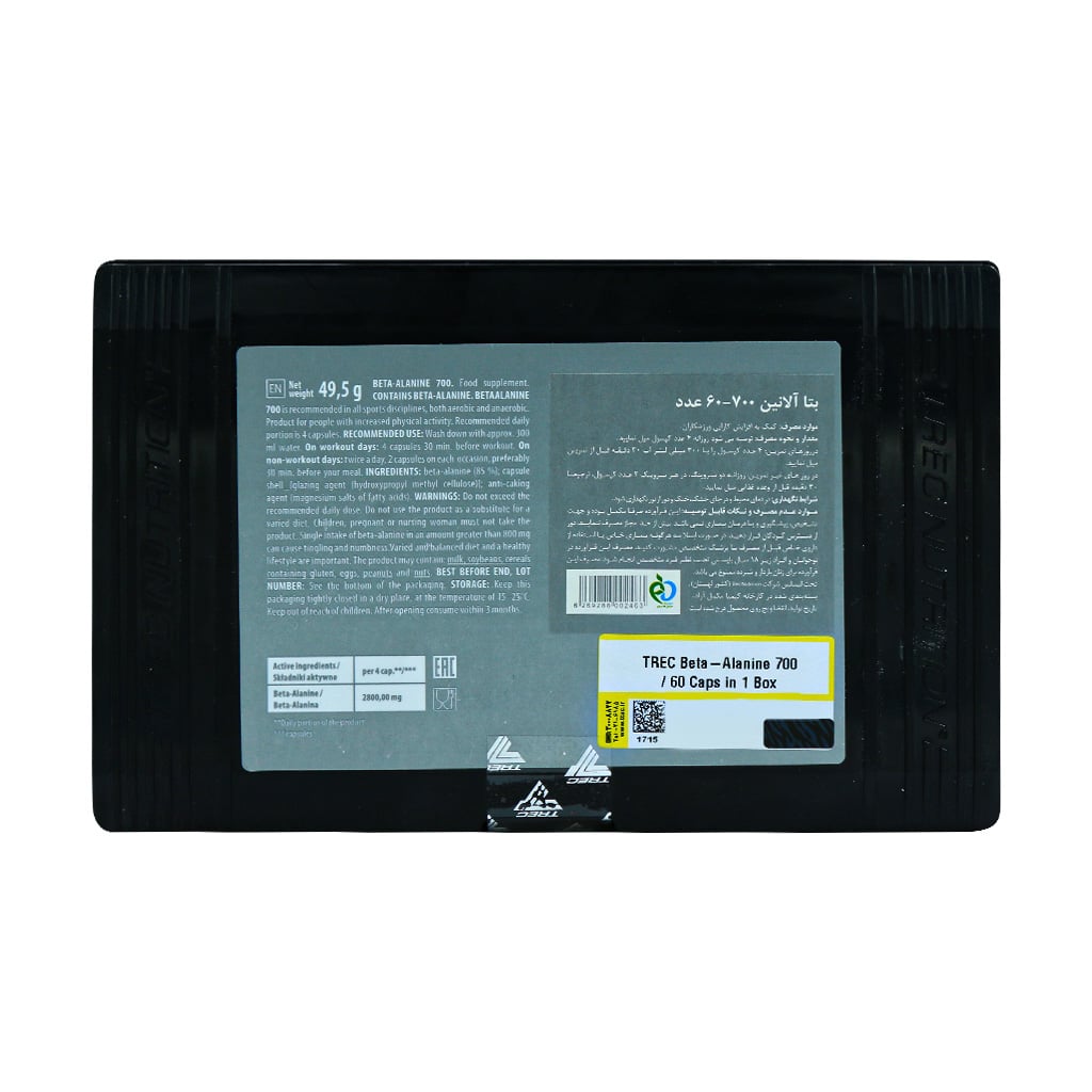کپسول بتا آلانین 700 ترک نوتریشن محصولی تحت لیسانس شرکت Trec Nutrition کشور لهستان است که در کارخانه کیمیا مکمل آراد در ایران بستهبندی شده و در 4 بلیستر 15 عددی در جعبه پلاستیکی عرضه میشود.