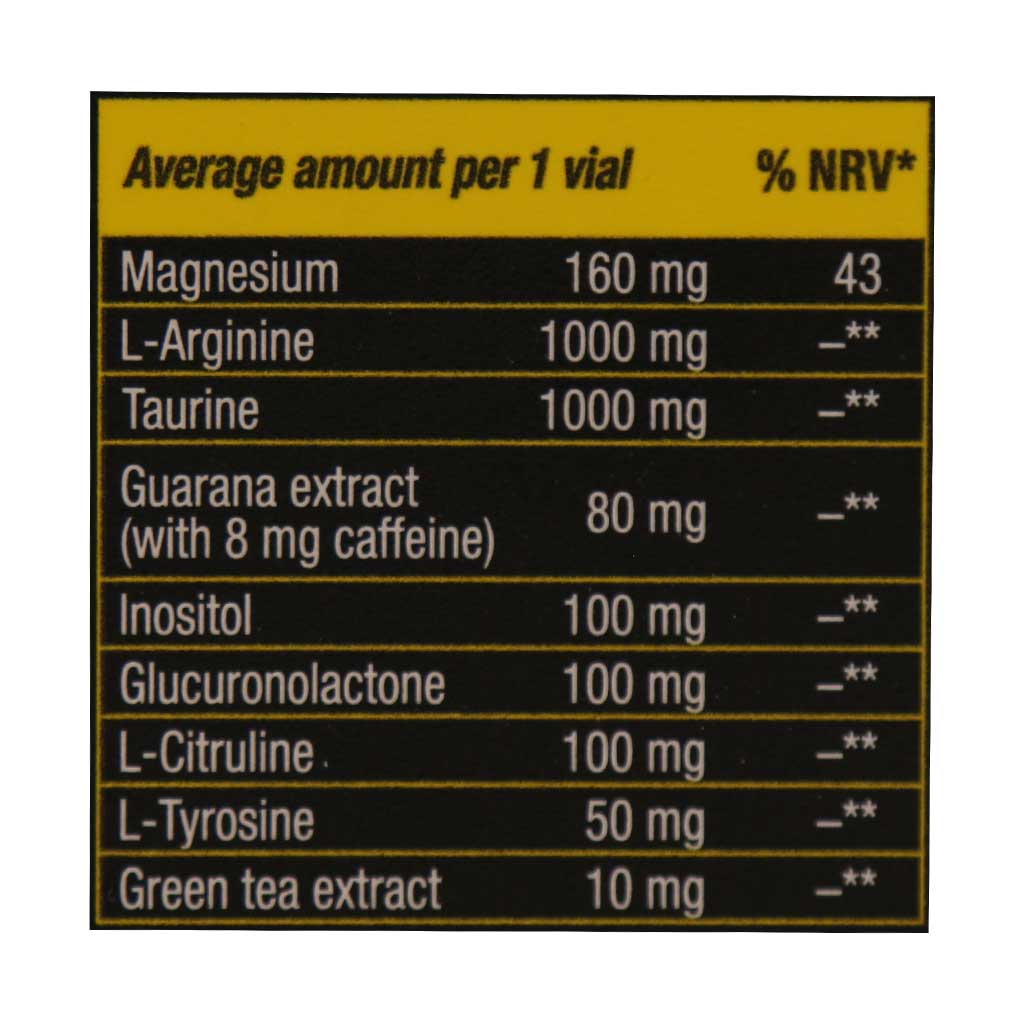 منیزیم: در هر ویال انرژی شات به میزان 160 میلی گرم از مینرال منیزیم جهت افزایش سطح انرژی، رفع گرفتگی عضلانی در ورزشکاران و کاهش خستگی وجود دارد.