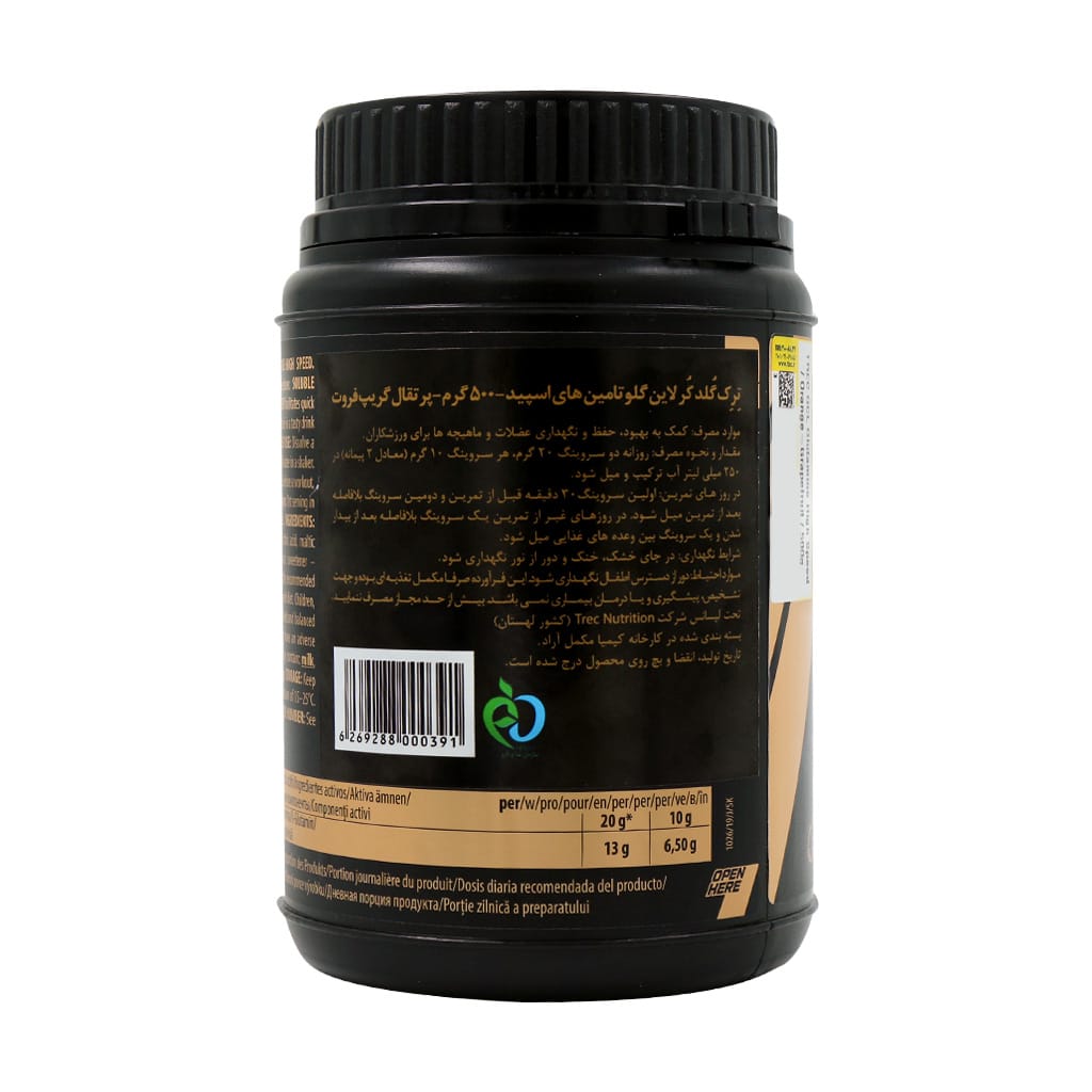 نقد و بررسی پودر گلوتامین های اسپید گلد کر لاین ترک نوتریشنپودر گلوتامین های اسپید گلد کر لاین ترک نوتریشن یک مکمل با قدرت حل شوندگی بسیار بالا و جذب راحت است. فرمولاسیون این فراورده موجب بهبود، حفظ و نگهداری عضلات و ماهیچه‌ها برای ورزشکاران می‌شود. گفتنی است گلوتامین رایج‌ترین اسید آمینه موجود در بدن است که مصرف آن در زمان انجام تمرینات بدنی شدید، لازم و ضروری است. زیرا گلوتامین با دارا بودن خاصیت ضد کاتابولیسم موجب جلوگیری از تجزیه پروتئین در عضلات می‌شود.زمان مصرف گلوتامینبهترین زمان مصرف گلوتامین سوالی است که توسط ورزشکاران پرسیده می‌شود. بهترین زمان برای تاثیرگذاری glutamin high speed درست قبل و بعد از تمرین است. اما در برخی از موارد توصیه می‌شود از مکمل‌های گلوتامین بلافاصله بعد از بیدار شدن، ۳۰ دقیقه قبل و بعد از تمرین و درست قبل از رفتن به رختخواب استفاده شود. این زمان‌ها بهترین موقع جهت بالا بردن سطح هورمون رشد و به دنبال آن افزایش حجم و قدرت توده عضلانی است. البته در نظر داشته باشید که در زمان مصرف گلوتامین گلد کر ترک، از مصرف مکمل‌های کراتین اجتناب نمایید. زیرا این دو اثر رقابتی داشته و از جذب صحیح دیگری جلوگیری می‌نمایند.نقش گلوتامین در بدنسازیعلاوه بر مهم‌ترین کاربرد گلوتامین که جلوگیری از ریزش عضلات است، فواید گلوتامین در بدنسازی شامل موارد دیگری نیز می‌شود. همانطور که می‌دانید سطح این آمینو اسید طی ورزش‌های سنگین در خون کاهش می‌یابد و بدن بدنسازان در زمان تمرینات آسیب می‌بیند. حال مصرف مکمل بدنسازی ترک نوتریشن با تامین گلوتامین، به بازسازی و ترمیم عضلات کمک نموده و سوخت چربی‌ها را نیز بالا می‌برد. این ترکیب همچنین به بهبود دستگاه گوارش کمک کرده و از بروز بیماری‌های روده جلوگیری می‌کند. به علاوه مصرف مکمل گلوتامین جهت بهبود و درمان مشکلات معده ورزشکاران مانند زخم معده نیز بسیار مناسب است.ویژگی های گلوتامین های اسپید گلد کر لاین ترک نوتریشن